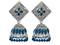 Make a bold statement with these dazzling traditional Jhumka-style earrings. Crafted with meticulous attention to detail, these earrings feature a square-shaped top encrusted with shimmering multicolor rhinestones and a floral motif of deep blue teardrop stones. The hanging jhumka is embellished with matching blue stones and intricate silver-toned filigree work, finished with a fringe of faceted blue beads. Perfect for weddings, festive occasions, or pairing with ethnic outfits for a glamorous touch.